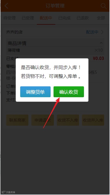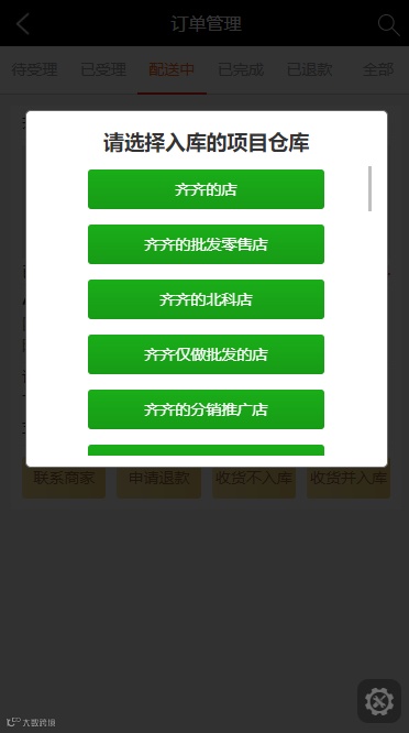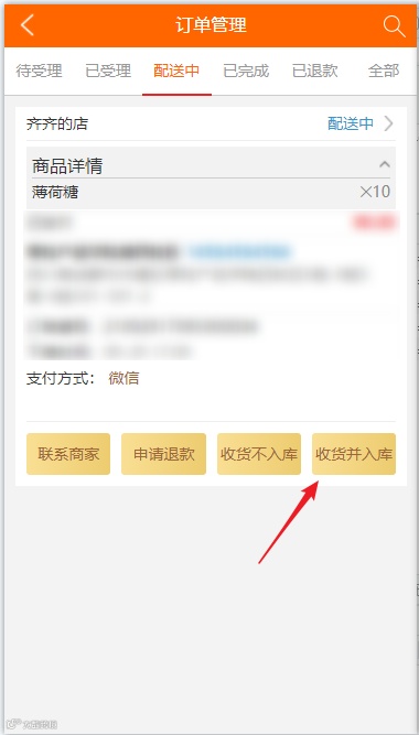 操作步骤:订单管理-配送中-收货并入库-确认收货-选择入库项目仓库