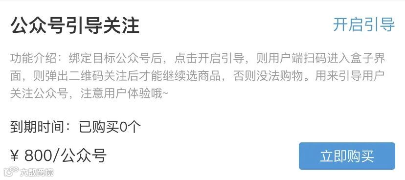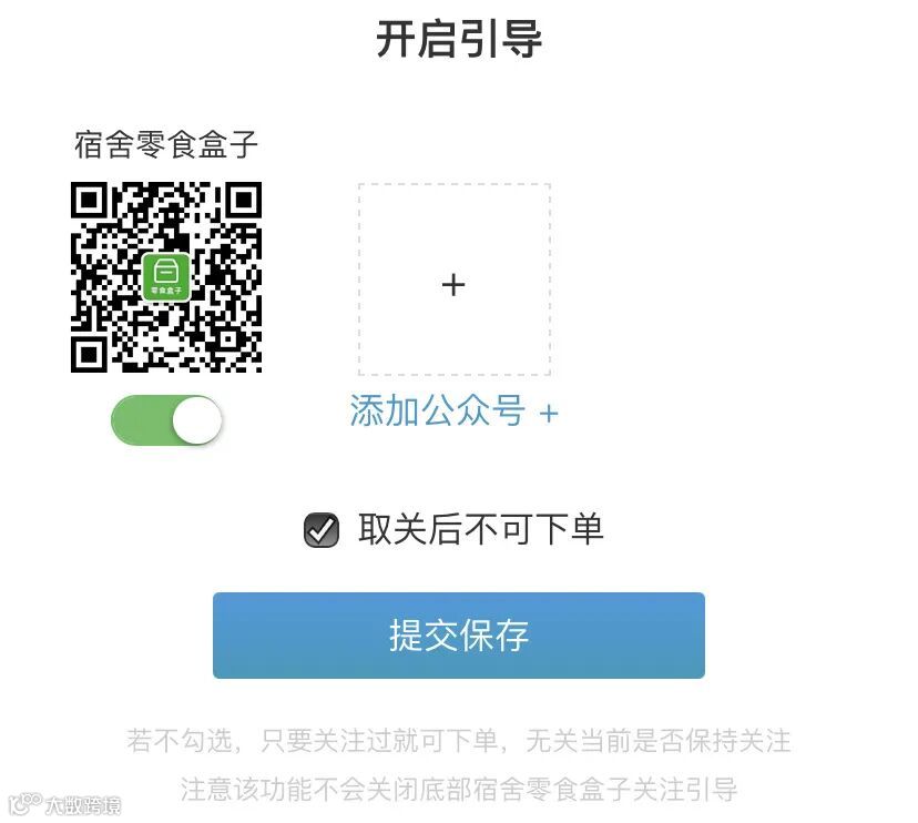 当盒主在运营零食盒子的同时又想运营自己的公众号,开通公众号引导关注之后用户需要强制关注盒主的公众号才可以下单,达到强制吸粉为盒主的公众号积累流量的目的和效果。