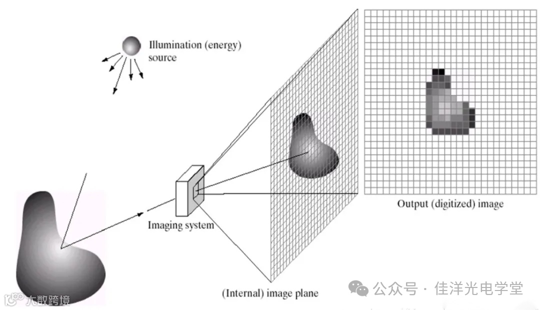 综合而言的数字化过程如下图所示,其表示的是从图像的真实来源,到最后的数字图像: