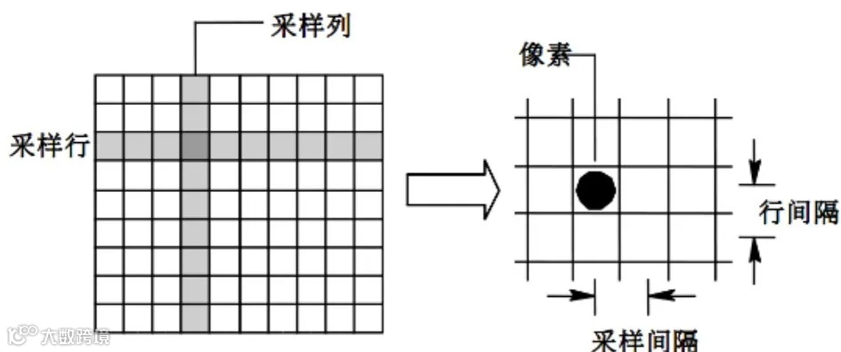 采样把一幅连续图像在空间上分割成 M×N 个网格,每个网格用一亮度值来表示。一个网格称为一个像素。M×N 的取值满足采样定理。