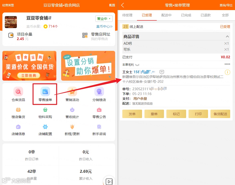 零售接单--用户下单后可在此进行受理并配送,可以看到所有的订单状态,待受理、已受理、配送中、已完成包括用户信息等等。