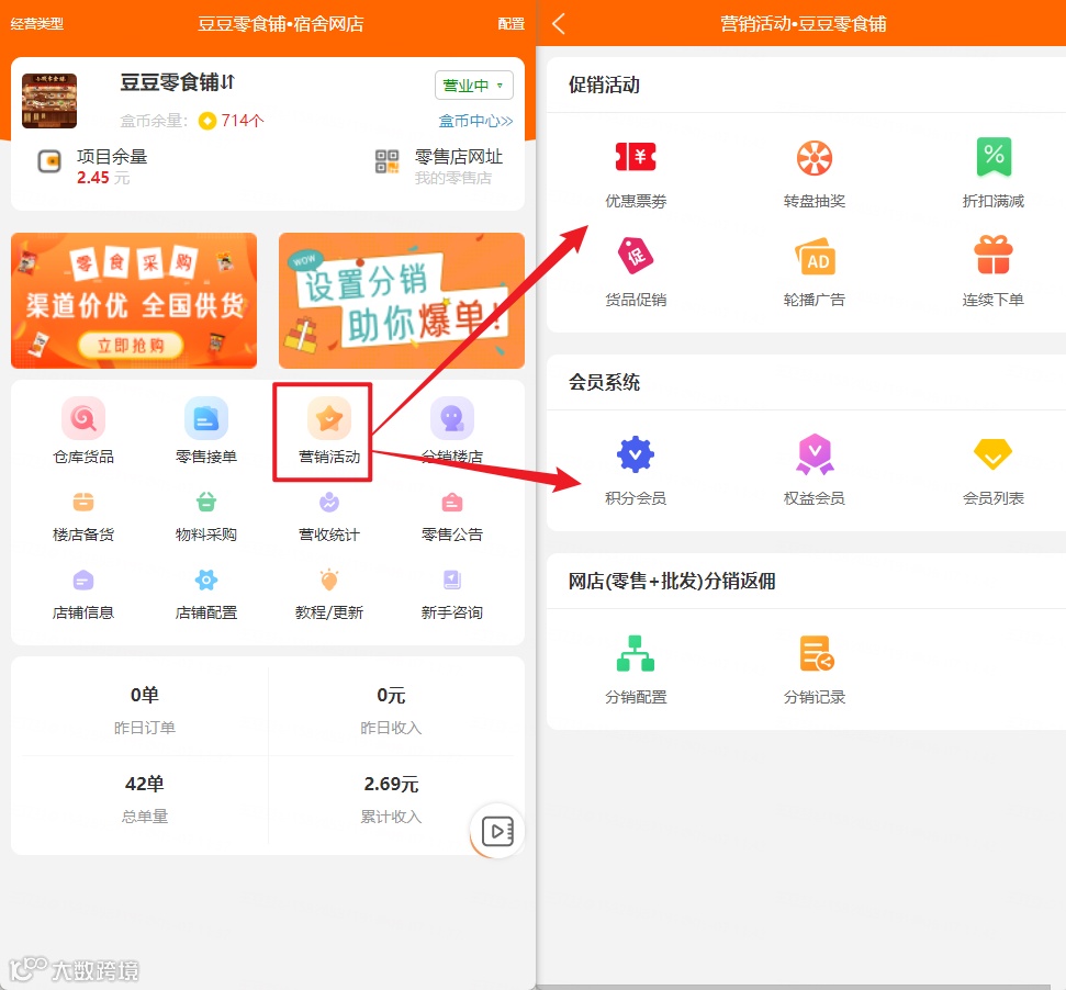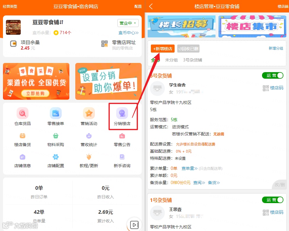 分销楼店--开设每栋楼的楼店作为分店,让楼长管理,有两种经营模式: