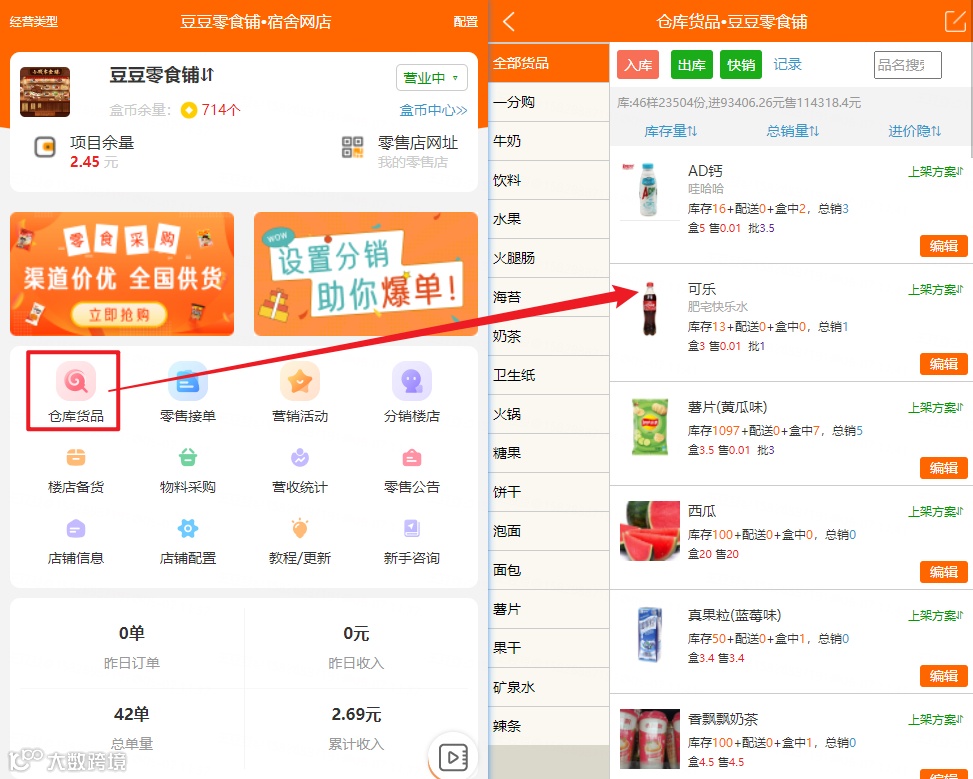 1.进货模式——由运营主将商品以批发价出售给楼长,楼长全权负责销售及配送,运营主不参与后续利益分配,仅赚取商品进货及批发之间差价。