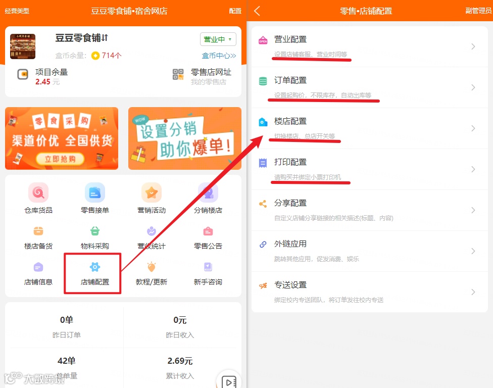 店铺配置--设置网店客服、营业时间、用户起购价格、配送费,绑定小票打印机等。