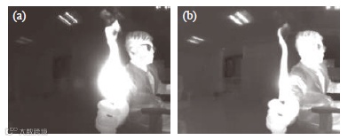 为验证中、长波热像仪对高温目标的成像效果,将打火机点燃后分别使用中、长波热像仪对其成像,对比效果图如图3所示,从图像可以观察出长波热像仪对打火机热源的热辐射不敏感,造成干扰影响较小。