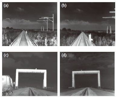 对比中波热像仪在静止状态与高速、高动态运动状态的成像效果,由于中波热像仪本身积分时间较大,在高速、高动态状态下易出现明显的成像模糊现象。长波热像仪积分时间较小,在静止和高速、高动态速状态下均能清晰成像,可以减小高超声速状态带来的图像模糊、抖动和偏移等影响。