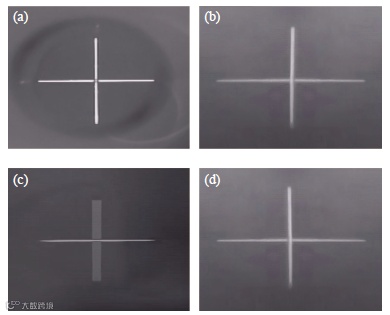分别将中、长波热像仪开机,调整相对应平行光管的位置,使十字靶标在热像仪视场中心,将窗口加热后放置热像仪与平行光管之间,观察显示器上平行光管的十字靶标图像变化,不同温度的高温窗口对成像影响如表1~2所示。