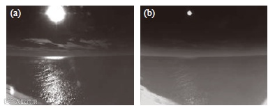 通过中、长波热像仪对海面、天空及太阳等场景成像效果对比分析可知(见图5),中波热像仪观测的太阳辐射、海面的“鱼鳞光”较明显,长波热像仪在抗太阳杂光、云层反射干扰方面占有优势。中波热像仪白天工作时,太阳散射、海面反射会产生较严重的干扰,阳光经海面反射后会在红外图像上形成高亮度区域(即形成镜面反射的海域),若目标以高亮度区域为背景,则会导致目标信噪比降低甚至被背景湮没,从而严重影响导引头锁定和跟踪目标,甚至丧失工作能力。对于长波红外8~14 μm波段,云层、海面反射的阳光在长波红外波段的响应较低,长波方案可避免水面反光、云层反光以及太阳辐射等干扰因素,提升系统探测和识别目标能力,并减少虚警干扰。