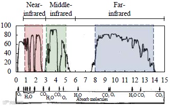 维恩定律揭示了黑体辐射的峰值波长与温度成反比,当黑体温度越高,辐射峰值波长越短(见图1)。此外,由于大气的吸收在1~3μm、3~5μm和8~14μm三个波段内相对较弱,且光线穿透能力较强,这三个区域被称为“大气窗口”(如图2所示)。现阶段高超声速飞行器携带的红外设备工作波段主要集中在中波(3~5μm)和长波(8~14μm),根据高超声速飞行器飞行环境、目标辐射特性以及背景辐射特性可选择适合的工作波段。