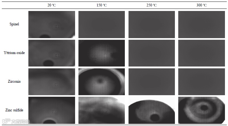 对比中波窗口热辐射对中波热像仪成像影响时,尖晶石窗口在150℃时热像仪图像饱和,高温250℃和350℃时,热像仪图像出现饱和,无法正常成像,相对透过率降28%左右;氧化钇和氧化锆窗口在150℃时成像效果较差,高温250℃和350℃时,热像仪图像均出现饱和,无法正常成像,相对透过率下降12%和15%左右;硫化锌窗口热辐射的影响较小,高温时仍可观察到十字靶标。对比硫化锌窗口热辐射对中、长波热像仪成像影响时,硫化锌窗口在高温时中、长波热像仪图像成像质量影响均较小,相对透过率衰减均较小,且硫化锌材料折射率均匀一致性好,可以作为双色红外光学系统材料。
