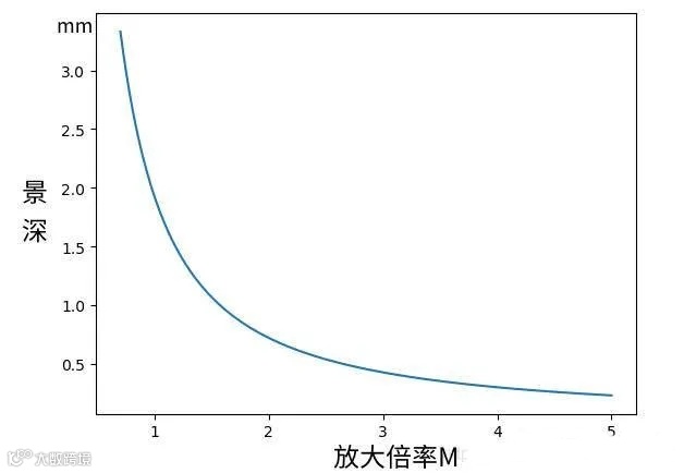 景深受放大倍率影响较大,随着放大倍率增大快速降低: