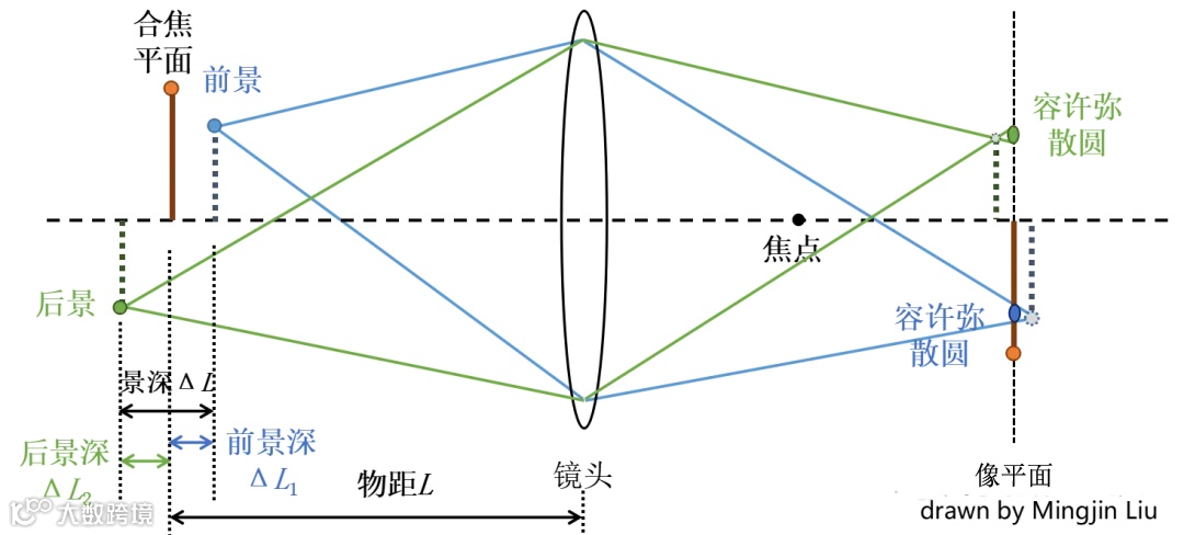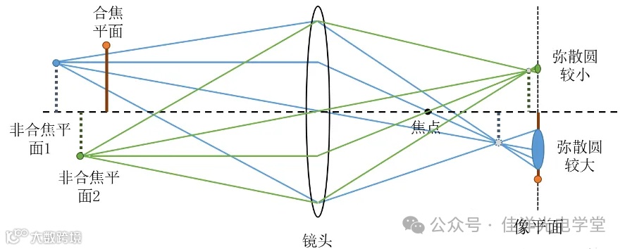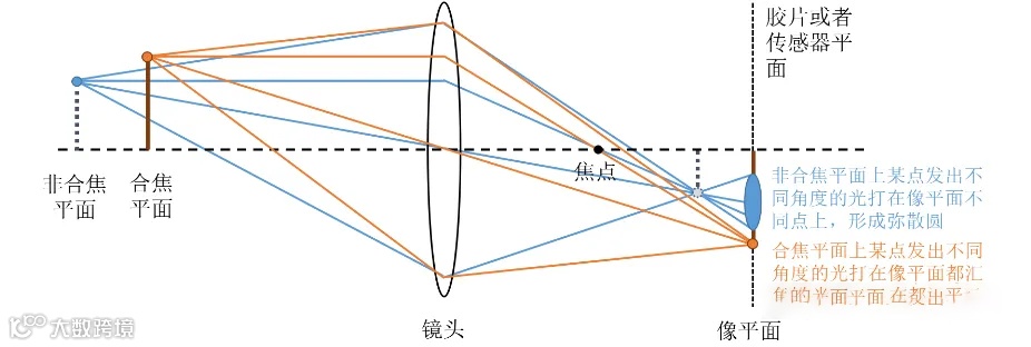 理解景深原理前,我们必须明白一件事:当我们对焦时,其实只有一个平面是真正合焦的。这个平面与像平面(可以简单理解为胶片或者传感器平面)平行。凡是在这个平面之前或者之后的都不是合焦状态。合焦平面上物体某点发出不同角度的光在像平面成像都汇聚于一点,而非合焦物体的某点发出不同角度的光会落在像平面不同点上,形成一个模糊圆,这个圆术语叫做弥散圆(circle of confusion)。