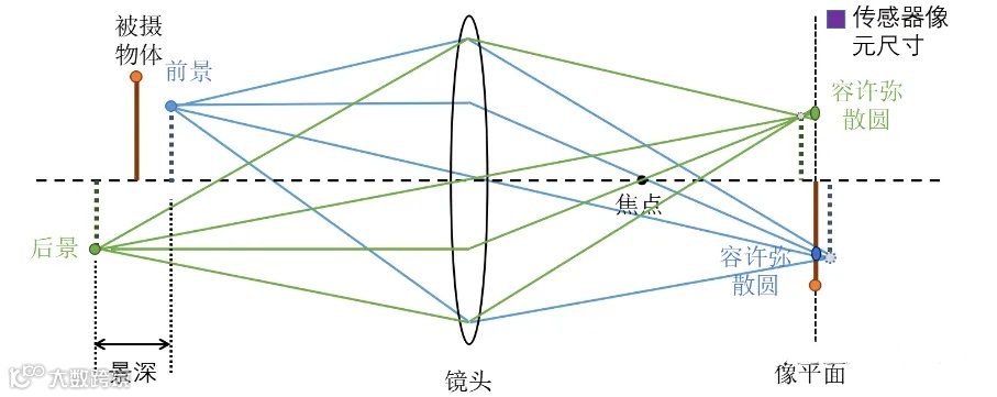 如果弥散圆小到人眼无法鉴别(或者说弥散圆直径小于传感器像元的大小),模糊圆可被视为点的成像,看起来就和对上焦的东西一样清晰,此无法分辨的弥散圆称为容许弥散圆(permission circle of confusion)。在被摄物体(对焦点或合焦平面)前后纵深,有一段距离,其影像在像平面的模糊程度肉眼无法分辨,比较清晰,都在容许弥散圆限定范围内,它们之间距离称为景深。