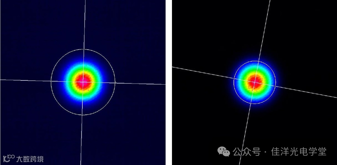 图2:同一氦氖激光光束的两种测量轮廓图。左图没有做背景减法,测量的直径偏大,为2.77mm。右图做了背景减法,测量结果更准确,测量值为1.80mm。