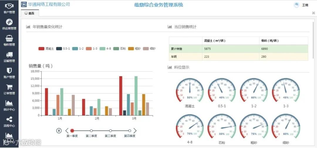 邢台中联建材示范园智能运营平台实现了骨料开采加工过程自动化,一卡通智能物流管理,汽运自动下料与装载智能化,生产制造与能源管控协同调度优化,互联网智能产销自动化。同时建立全公司生产运营系统监控平台,实现了生产流程数据可视化与生产运营优化调度管理。