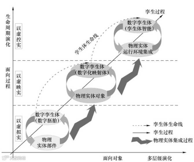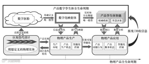 因此可以看出产品数字孪生体是产品全生命周期的数据中心,刻画了产品从设计阶段、使用服务到报废/回收的所有信息和模型。产品数字孪生体采用全数字量表达产品的几何特征、性能、状态和功能,作为全生命周期信息的唯一依据。同时,产品数字孪生体也是全价值链的信息集成中心,其主要目的在于整个价值链中的价值”在时间和空间上无缝协同,这不仅是共享产品的信息,也是一种在空间上基于信息唯一性的全价值链服务协同。因此,产品信息能够在全价值链实现可追溯/可追踪性,并能够返回产品数字孪生体中,最终将形成信息高度闭环的产品数字孪生体,图3 展现了这一虚实高度融合过程。