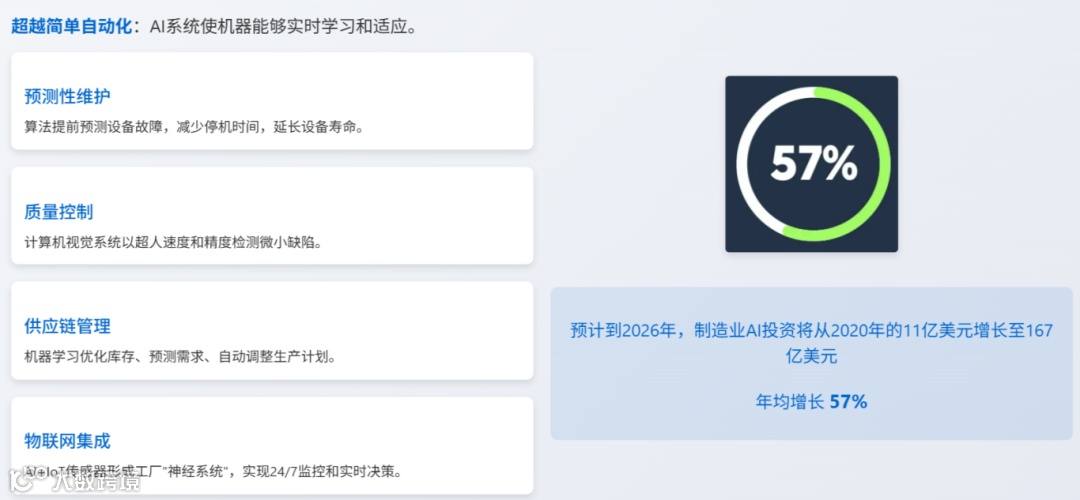 制造业正在经历其历史上最具变革性的转折之一,人工智能不再仅仅是一种创新,而是逐渐成为竞争的必需品。根据预测,到2026年,人工智能在制造业的投资预计将增长57%,从2020年的11亿美元猛增至167亿美元。