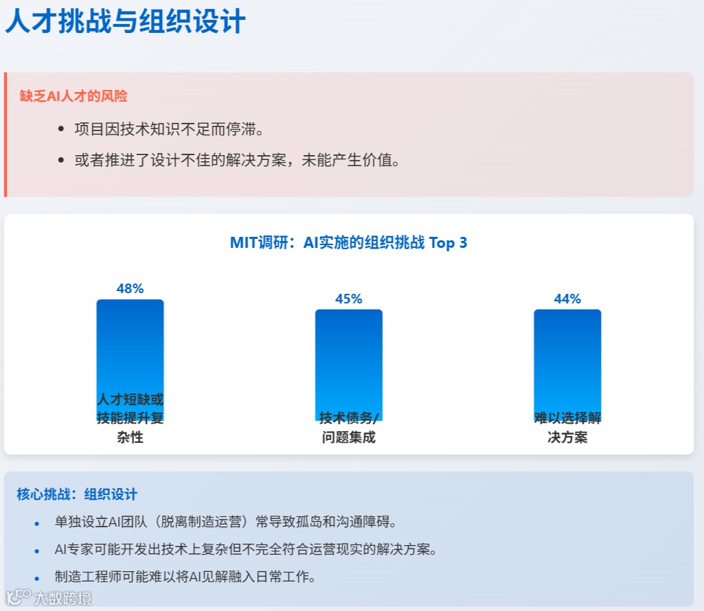 成功实施AI不仅仅是招聘技术专家,更是要解决如何将新AI能力与深厚的传统制造专业知识相融合的组织设计挑战。