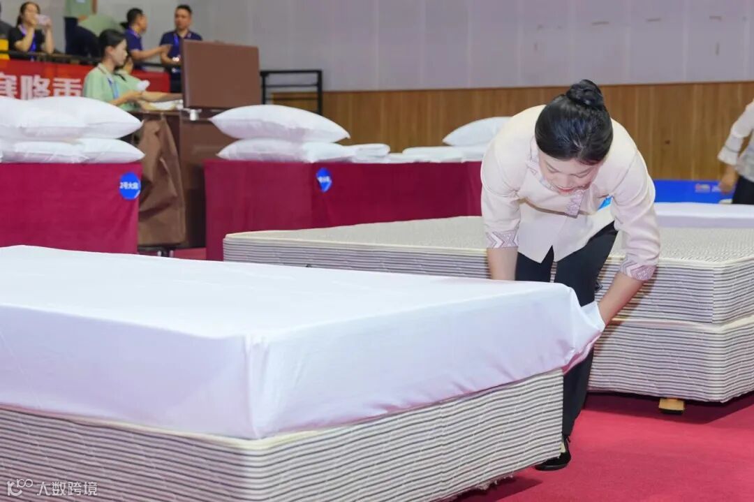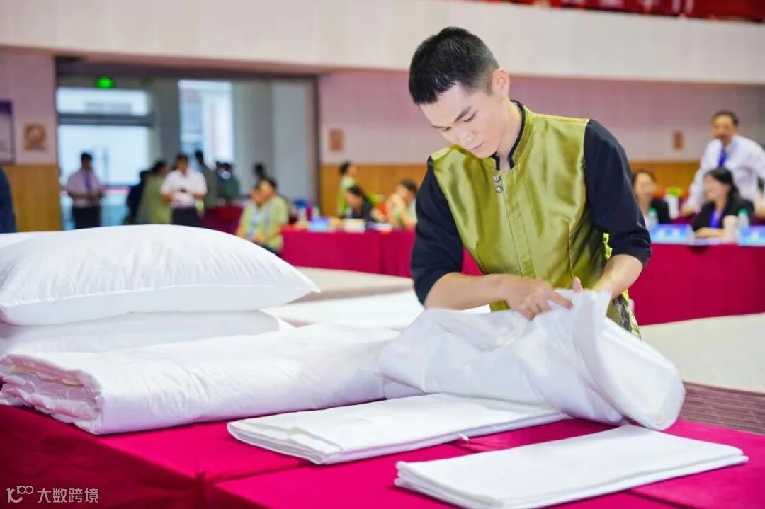 客房服务项目,选手利落地抖开床单,床垫包角、套被子、套枕头等一系列动作如行云流水,惹人惊叹。一抛一合之间,一床平整光滑、四角挺立的棉被就浮现眼前。