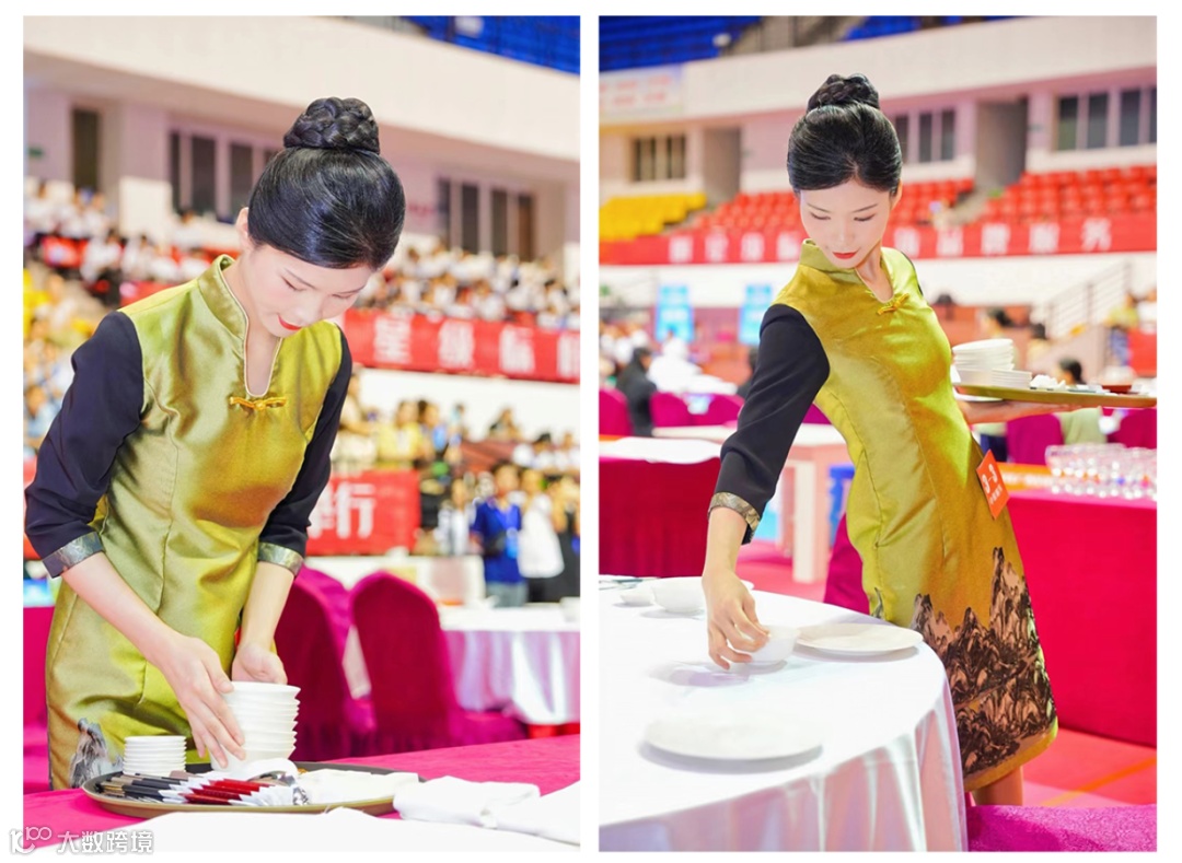 中餐服务项目,沃顿酒店选手动作优雅,仪态端庄,台上之餐,一筷一勺,将整套操作演绎得精彩纷呈。选手娴熟地折叠出不同的动植物餐巾杯花,方寸之间,妙手生花,呈现出如画的美感。