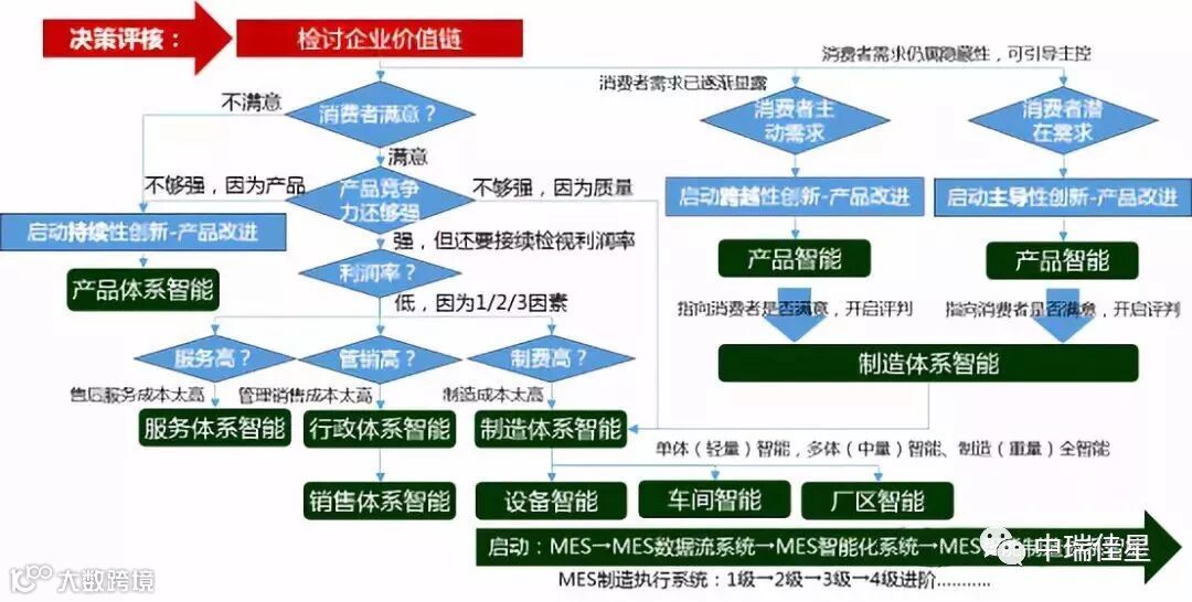 本图示,读者可从红色框位置,开始启动检视企业自家的状态,逻辑性的推算,得到企业应该从哪个智能体系实施,最具价值性。关于红色框的所谓企业价值链,本处并未定义,留待下文时,笔者再写文补充说明。