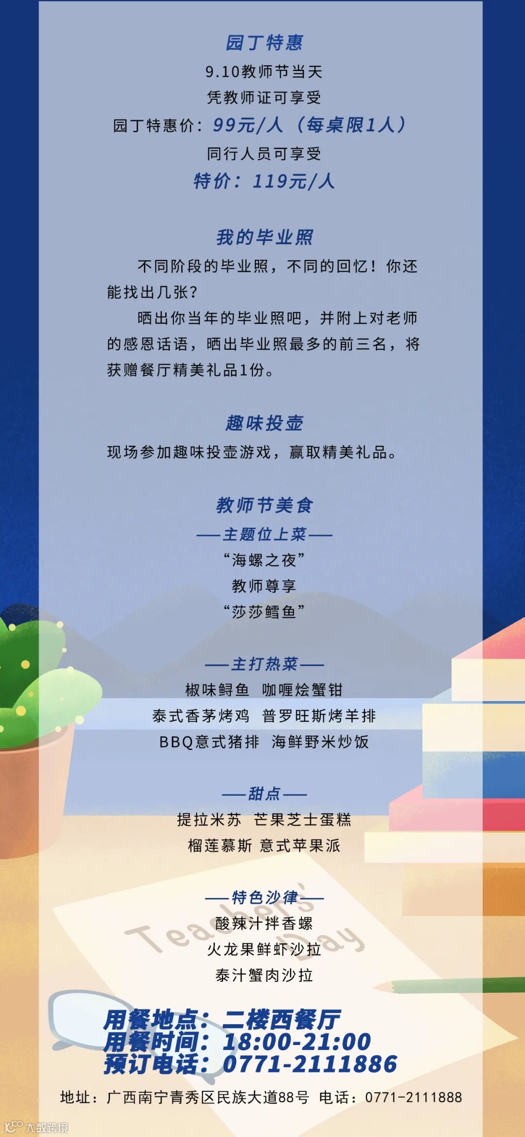 导读:用餐地点:二楼西餐厅预订电话:0771-2111886