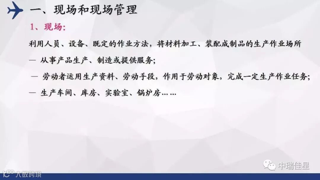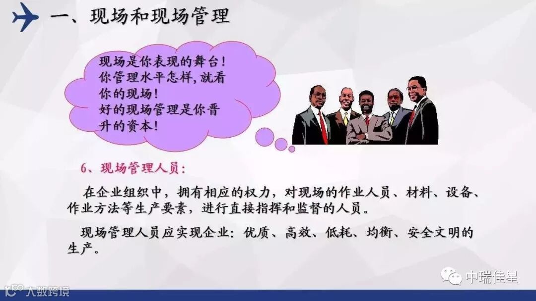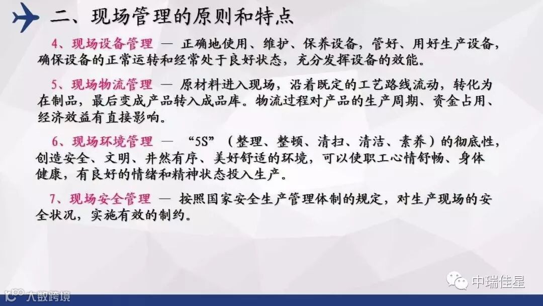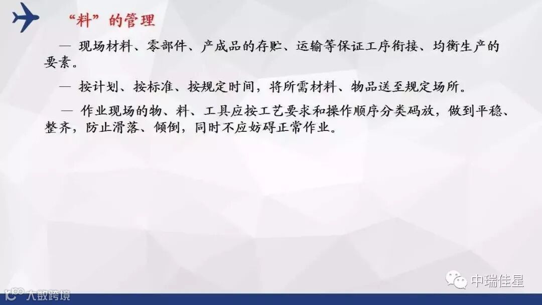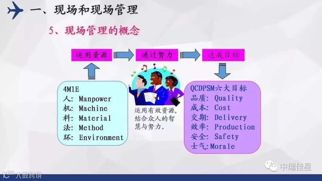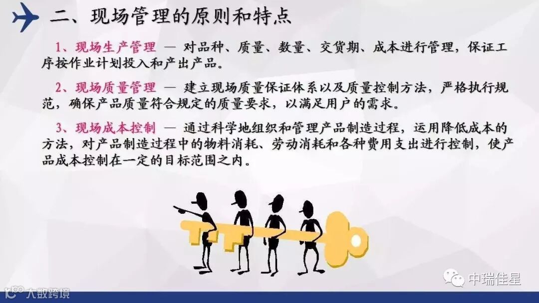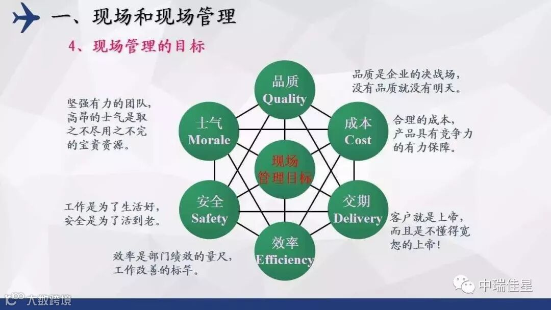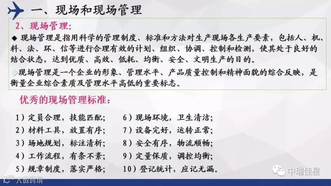 中瑞佳星导读:现场管理就是指用科学的管理制度、标准和方法对生产现场各生产要素,包括人(工人和管理人员)、机(设备、工具、工位器具、工装夹具)、料(原材料、辅料)、法(加工、检测方法)、环(环境)、信(信息)等进行合理有效的计划、组织、协调、控制和检测,使其处于良好的结合状态,达到优质、高效、低耗、均衡、安全、文明生产的目的。