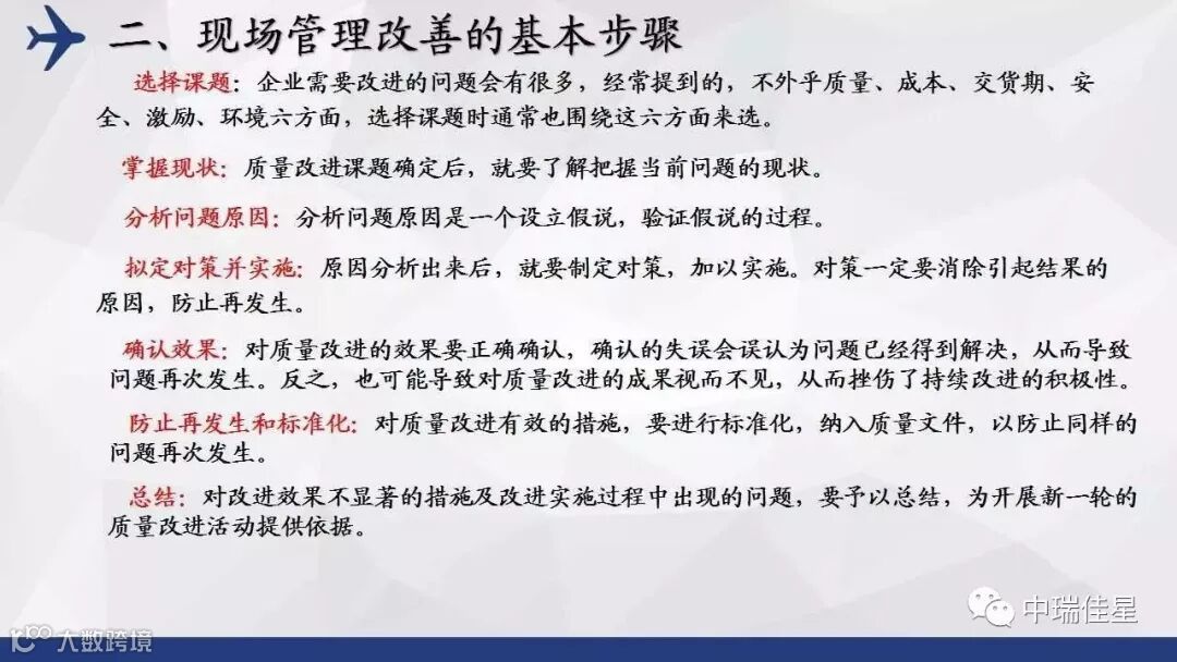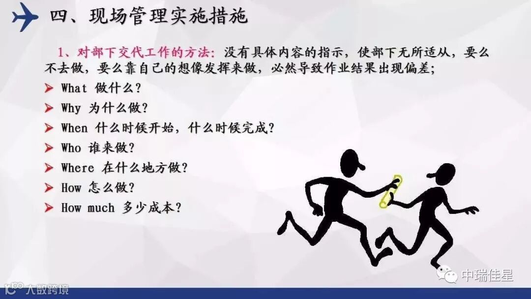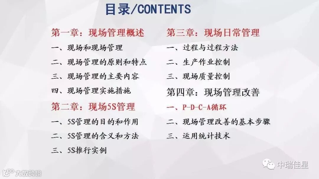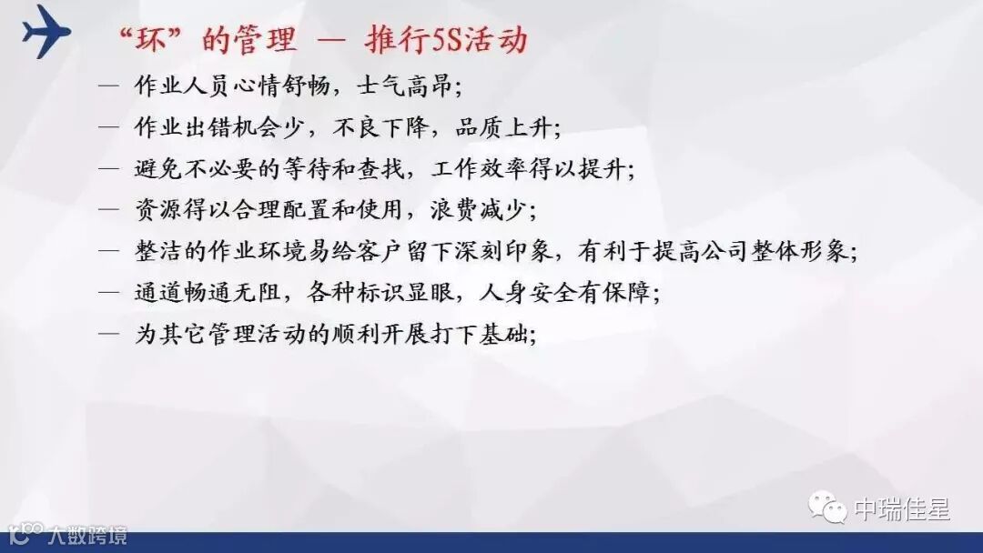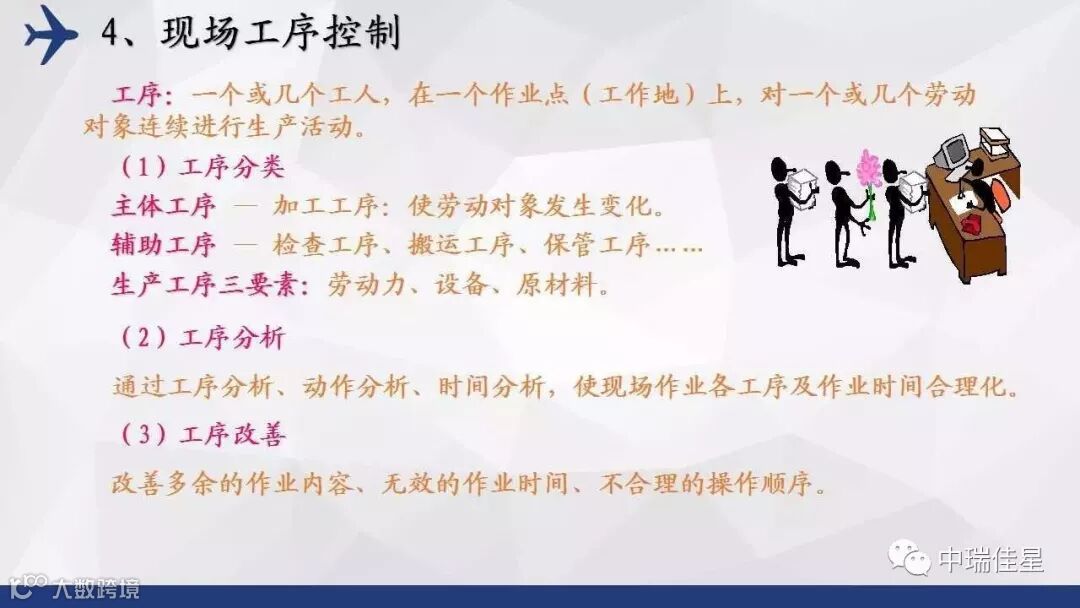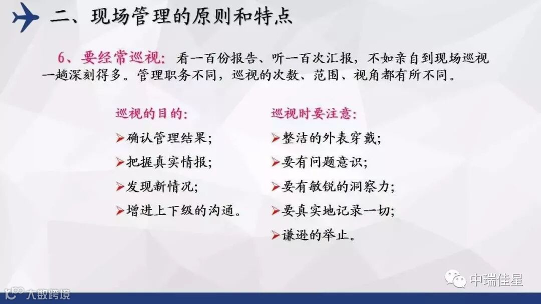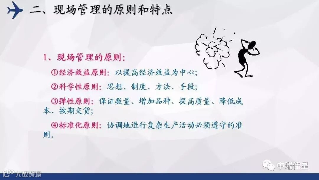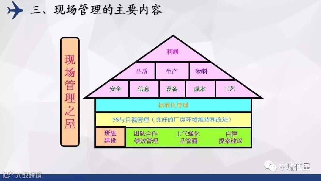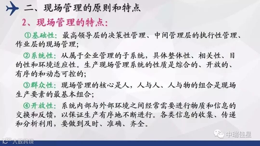 中瑞佳星导读:现场管理就是指用科学的管理制度、标准和方法对生产现场各生产要素,包括人(工人和管理人员)、机(设备、工具、工位器具、工装夹具)、料(原材料、辅料)、法(加工、检测方法)、环(环境)、信(信息)等进行合理有效的计划、组织、协调、控制和检测,使其处于良好的结合状态,达到优质、高效、低耗、均衡、安全、文明生产的目的。