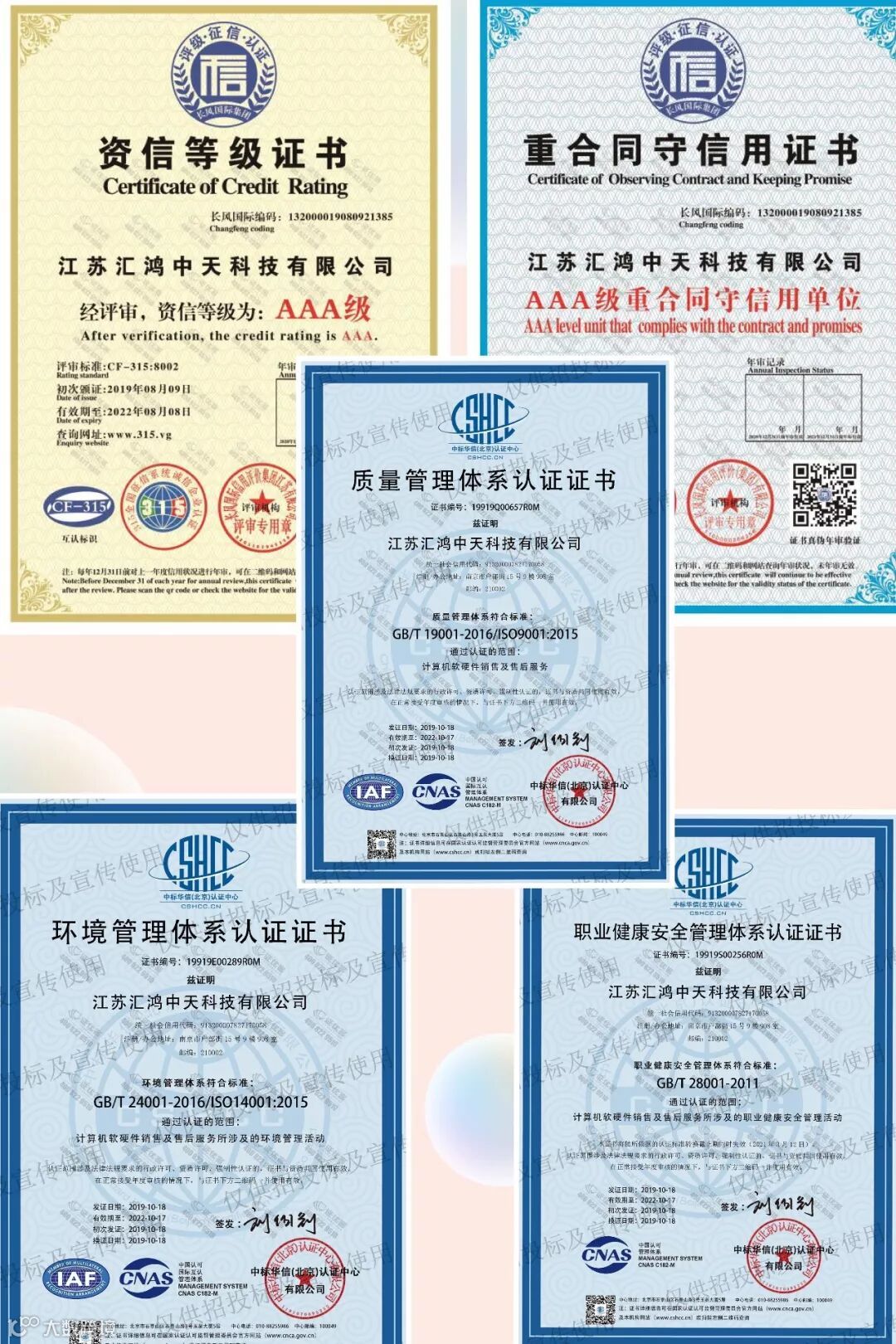 为适应公司发展的需要,进一步提高公司整体的管理水平,依据GB/T19001-2016、GB/T24001-2016、GB/T28001-2011的标准建立本公司的质量、环境、职业健康安全管理体系,并同步申请了AAA资信等级、重合同守信用、ISO9001质量管理体系认证、ISO14001环境管理体系认证、OHSA18001职业健康安全管理认证五本证书。