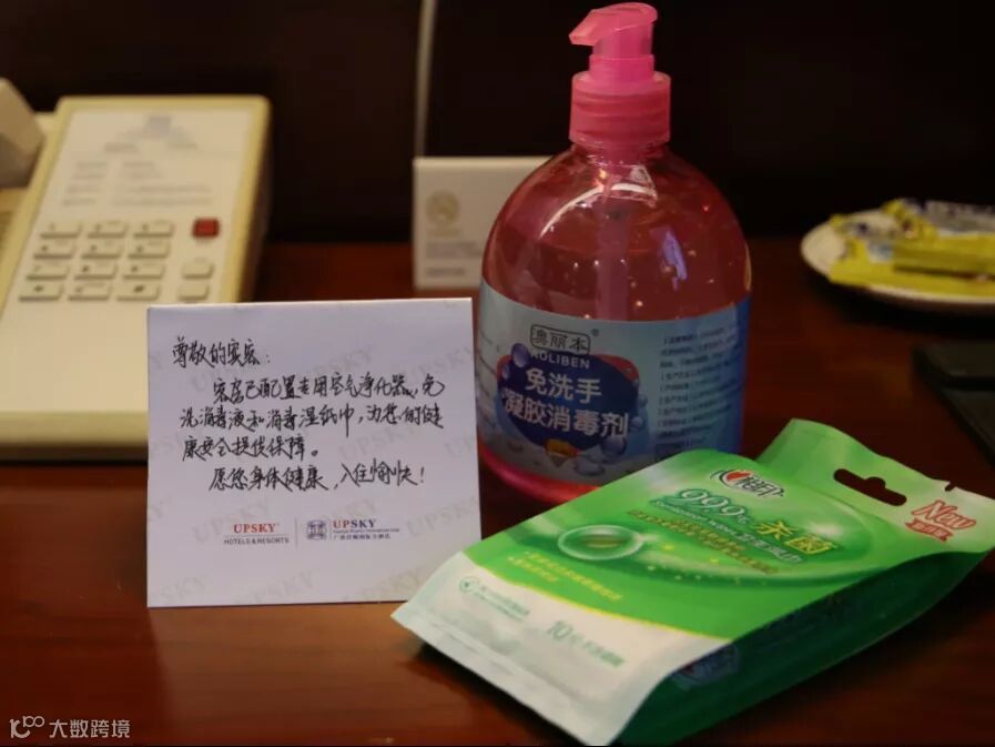 客房方面,每日对客房进行专业全面的清洁与消毒,并在房间配置专用空气净化器、免洗消毒液和消毒湿纸巾,为您的健康安全提供保障。