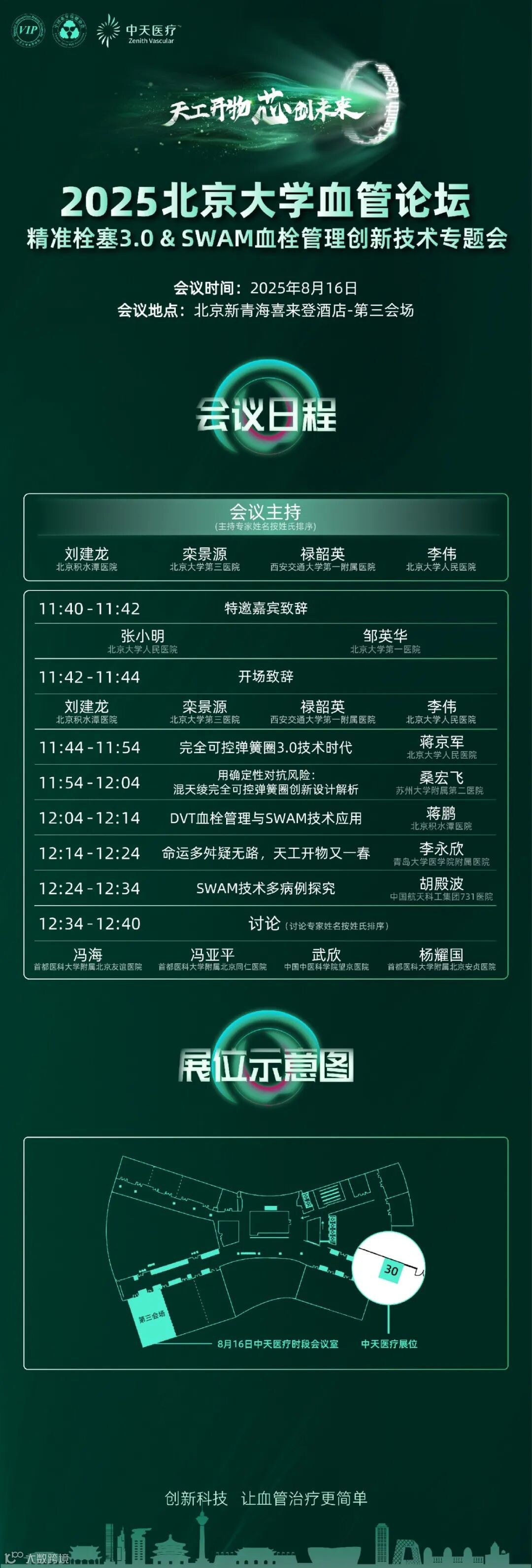 由中国老年保健协会主办,北京大学第一医院、北京大学人民医院、中日友好医院和北京大学第三医院联合协办的“2025北京大学血管论坛”将于2025年8月14-16日在北京召开。会议期间,中天医疗将以“精准栓塞3.0&SWAM血栓管理创新技术”为主题,亮相本次论坛。