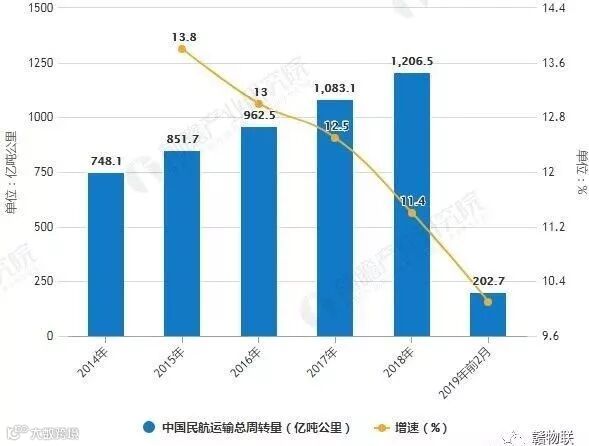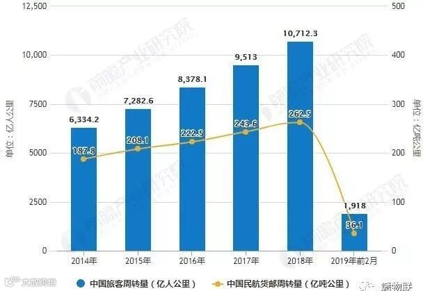 2019年以来,航空运输业整体依旧保持较好发展态势,但航空货运市场较为低迷。从周转量来看,根据民航局数据统计,2019年1-2月,全行业完成运输总周转量202.7亿吨公里,比上年同期增长10.1%。国内航线完成运输总周转量133.3亿吨公里,比上年同期增长11.6%,其中港澳台航线完成2.9亿吨公里,比上年同期增长9.5%;国际航线完成运输总周转量69.4亿吨公里,比上年同期增长7.3%。