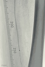 造影下抵达病变部位过程影像:导丝配合长鞘翻山至对侧,行左股动脉和膝下动脉造影,提示左股浅动脉6cm短段闭塞,考虑狭窄伴血栓形成,胫前动脉通畅,胫后动脉及腓动脉纤细,侧枝丰富。
