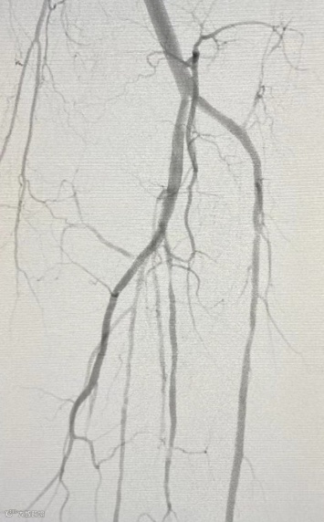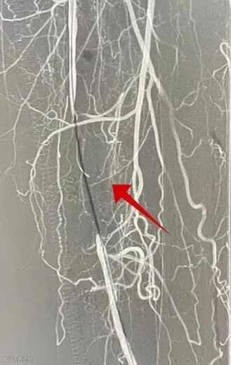 股浅动脉恢复通畅,球扩后造影见左侧胫腓干动脉栓塞,考虑栓子脱落。