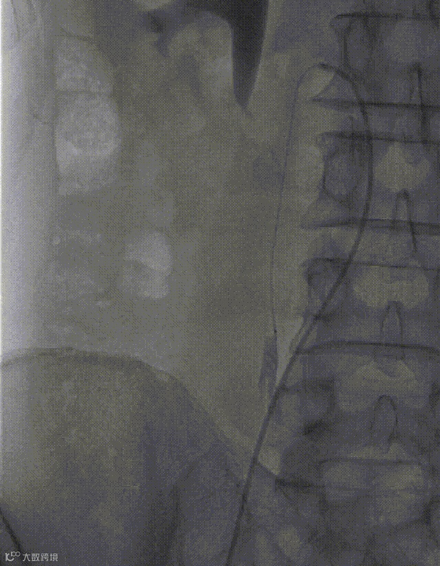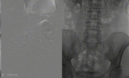 导丝配合单弯导管超选进入右侧卵巢静脉手推造影剂未见明显返流。