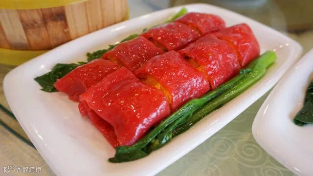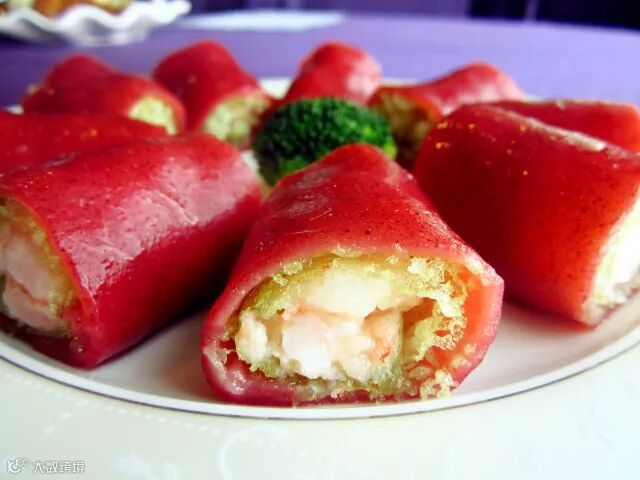 虾肉表面裹了一层面粉炸的酥脆,然后再裹上柔韧有嚼劲的红米肠粉皮,一口咬下去,外表绵密中间酥脆里面鲜嫩,三重口感充斥味蕾!