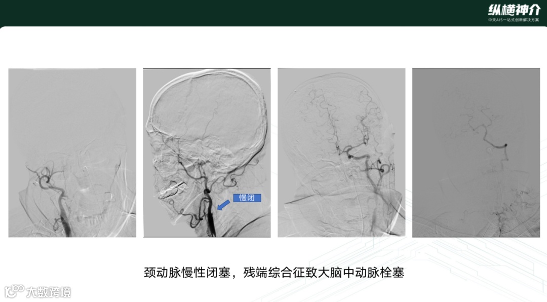 这是一例颈动脉慢性闭塞,残端综合征导致大脑中栓塞的患者。造影提示右侧颈内动脉起始处闭塞。左侧颈内动脉和后循环均有代偿供血。