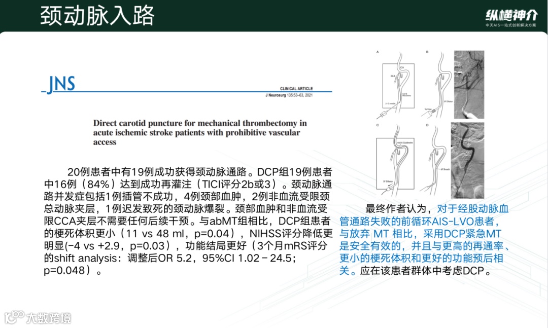 对于上肢和下肢入路均无法到位的前循环治疗的患者,可以选择颈动脉穿刺入路。