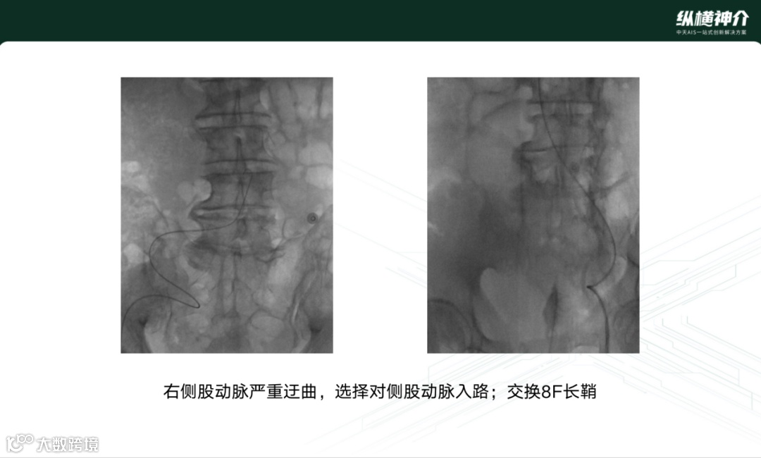 这是一例右侧股动脉严重迂曲,选择对侧股动脉入路,交换8F长鞘,为远端的血管治疗建立了可靠的血管通路。