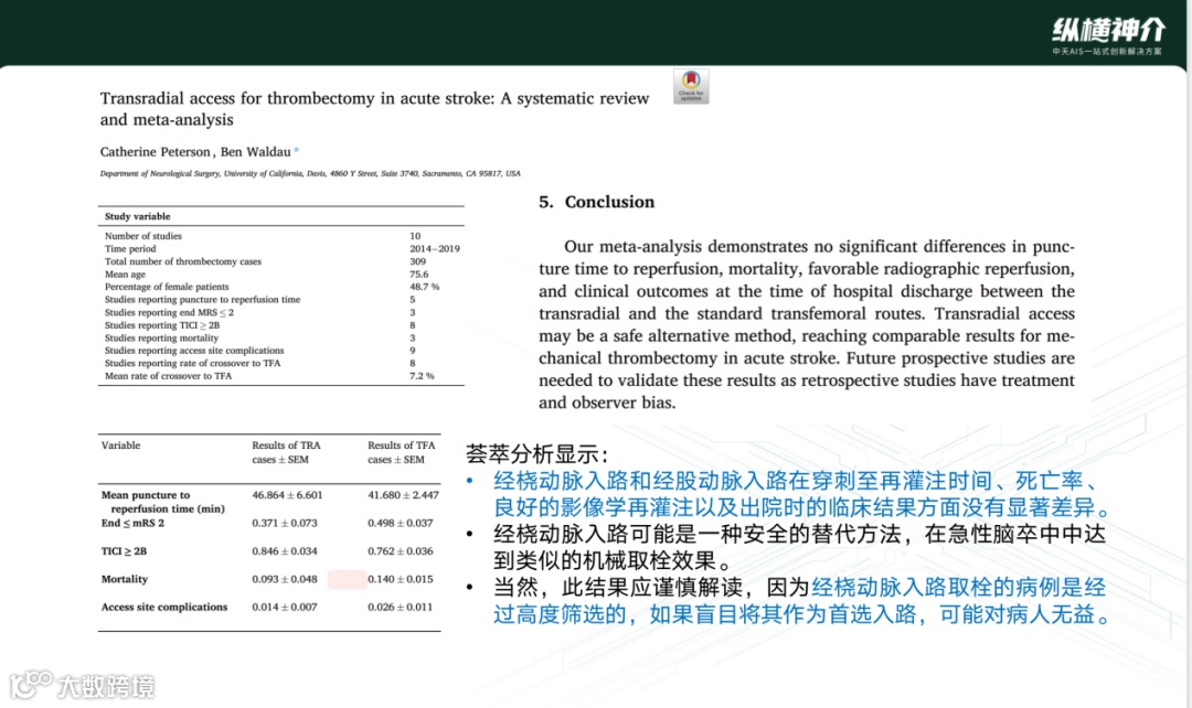 文献显示经桡动脉和经股动脉入路在穿刺至再灌注时间、死亡率、良好的影像学再灌注以及出院时间的临床结果方面没有显著差异。但我们在急诊血管内治疗中如果没有进行高度筛选,不应该首选上肢入路。