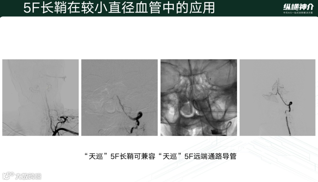 对于血管直径比较小的患者,我们可以选择5F 天巡神经介入专用长鞘,既可以保证导管的顺利到位,也可以减少血管痉挛和阻塞前向血流的可能性。同时5F 天巡神经介入专用长鞘可以兼容5F 天巡远端通路导管,对于远端病变可以使用ADAPT和SWIM技术。