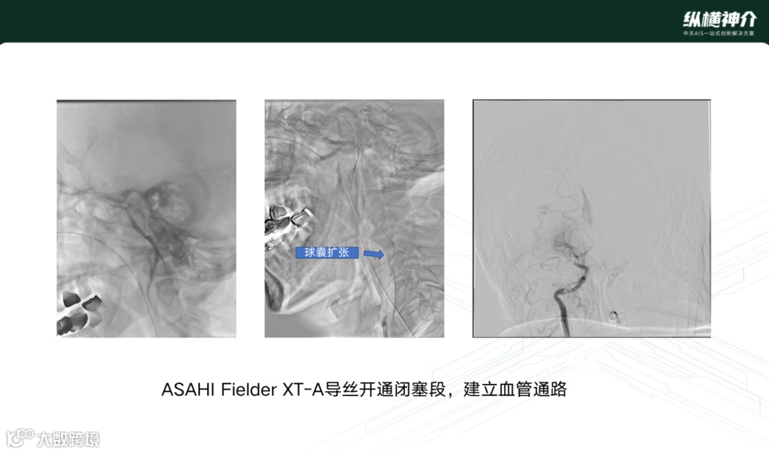 因为近端入路血管的闭塞,无法建立有效的血管通路。我们选择了ASAHI XT-A导丝通过闭塞部位,通过小球囊逐步扩张和球囊穿梭技术将6F长鞘输送至颈内动脉C1段远端,后造影提示大脑中栓塞。