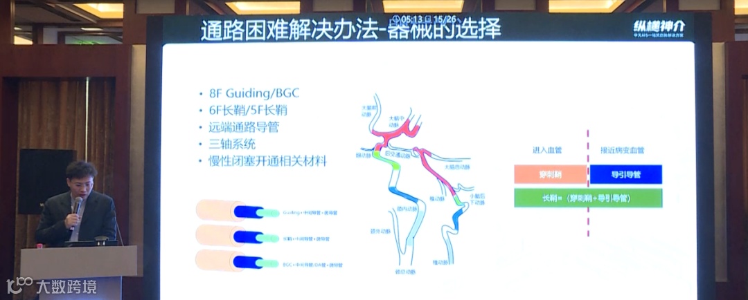 选择好合适穿刺部位后,通路器械的选择非常重要。常用的器械包括:8F导引导管/BGC、6F长鞘/5F长鞘等,器械选择上尽可能靠近病变部位,缩短治疗距离。我们普通的导管只能到达图片中的灰色区域,长鞘可以到达蓝色的血管区域,而远端通路导管则可以到达更远端的病变部位。