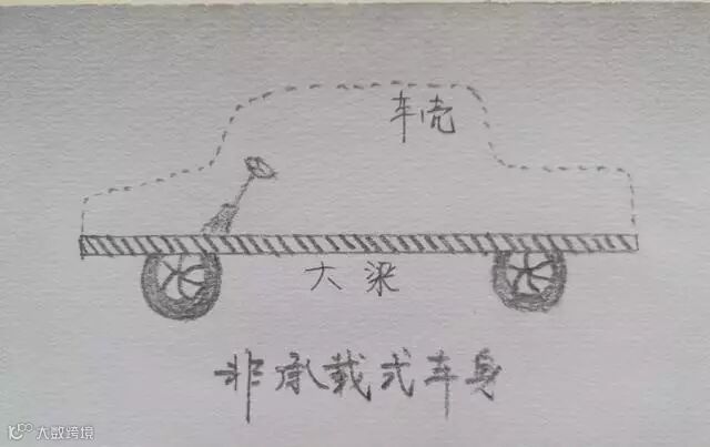 看图非常简单明了。所谓非承载式车身,其实就是车壳和大梁是分开的,全车有单独的大梁(学名叫刚性车架),车壳安装在大梁上。这种车身结构,因为底盘有大梁,所以非常结实耐用,不易扭曲变形,抗冲击能力极强。所有的卡车都是非承载式车身。硬派越野车都是非承载式车身。个别的SUV也用了非承载式车身。所以,硬派越野车的核心之一就是底盘带大梁!