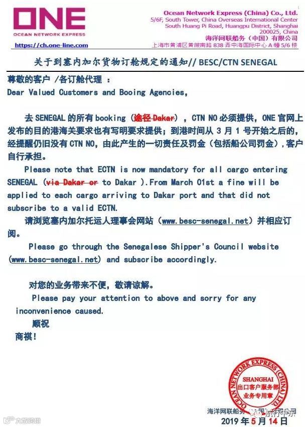 ONE海洋网联船务:去SENEGAL的所有booking ,CTN NO必须提供,ONE 官网上发布的目的港海关要求也有写明要求提供;到港时间从3月1号开始之后的,经提醒仍旧没有CTN NO,由此产生的一切责任及罚金(包括船公司罚金),客户自行承担。