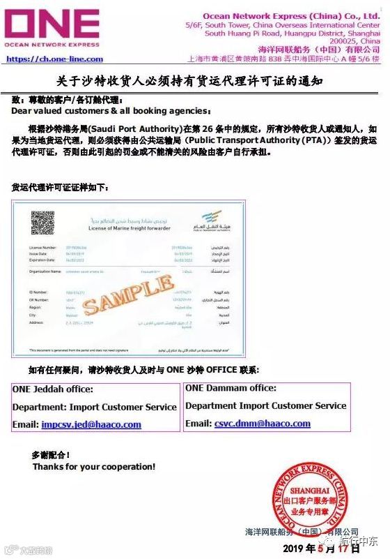 ONE海洋网联船务:根据沙特港务局(Saudi Port Authority)在第26条中的规定,所有沙特收货人或通知人,如果为当地货运代理,则必须获得由公共运输局(Public Transport Authority (PTA))签发的货运代理许可证,否则由此引起的罚金或不能清关的风险由客户自行承担。
