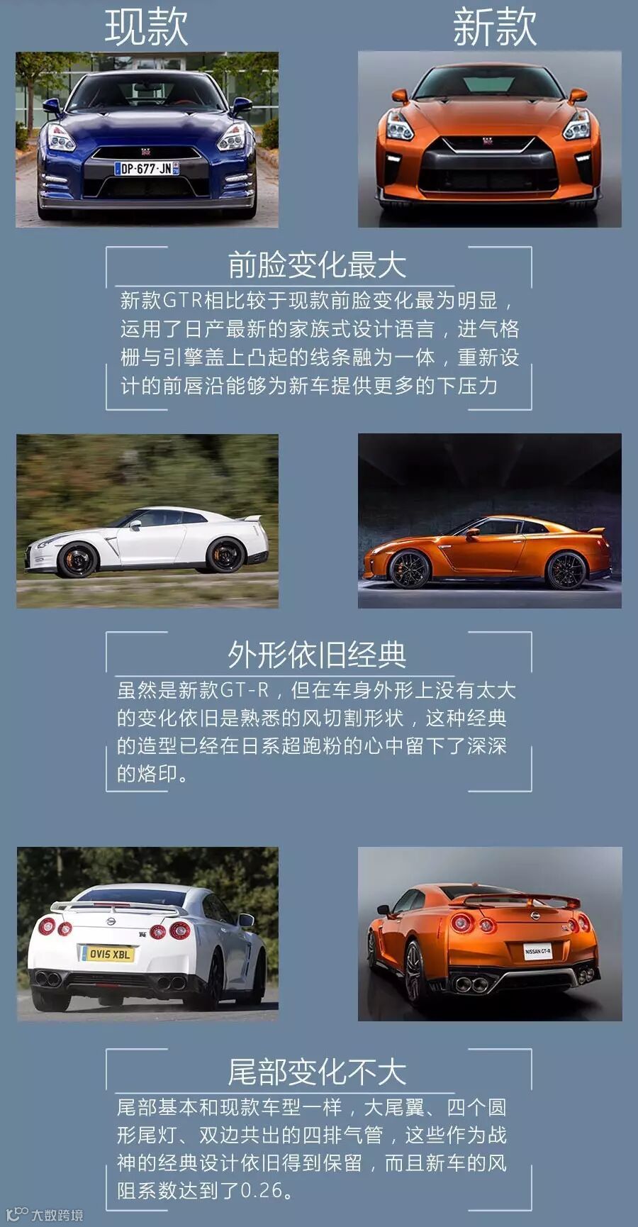 2017款GTR属于R35车系,是GTR的第六代车型,承接R33和R34的经典血统。这一代第一款R35于2008年正式发布,直到2017款GTR-R35诞生,日产的性能部门仍然拼命压榨R35的剩余价值。作为改款车型,新款GT-R依然沿用了这代经典的风塑外形设计,内饰采用简洁的设计风格,底盘重新调校使得高速过弯更加的稳定,马力较现款车型也有所增加。
