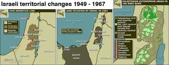 以上图片展示了以色列1948年至今的领土变化。左图中的加沙地带当时还处于埃及控制,约旦河西岸则由以色列人控制。1967年,“六日战争”(第三次中东战争)爆发,以色列最终击败了由埃及、约旦和叙利亚组成的联军,之后占领了埃及控制的加沙地带和西奈半岛,约旦控制的约旦河西岸和耶路撒冷旧城,叙利亚的戈兰高地共6.5万平方公里的土地。直到1979年3月31日,埃及与以色列签署《戴维营协议》后,以色列才将西奈半岛归还给埃及,但仍占领着其他区域至今。