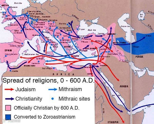 红箭头:犹太教 天蓝箭头:密特拉教 深蓝箭头:基督教 蓝点:密特拉传教地点