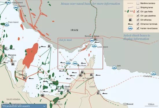 正是因为其重要的战略地位,出于对美国等西方国家的警戒(美国海军第5舰队司令部所在地就设在巴林),伊朗十分重视霍尔木兹海峡沿岸的军事基地和防线建设。本图展示了霍尔木兹海峡附近的石油、天然气以及军事基地的分布情况。